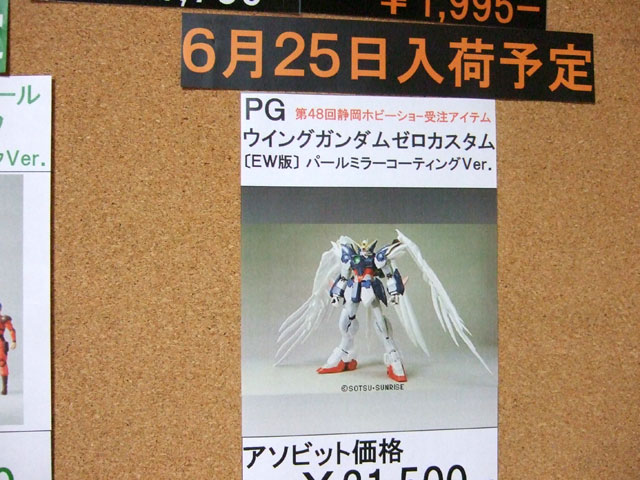 キャラシティ2Fにて、6月のバンダイもの+αの入荷予定日の掲示が開始していました。それによると「ボディ外装部はパールメタリック使用。特徴的な大羽はハーフクリア、ピンクパールコーティング塗装で虹色」等になっているPGの豪華版「1/60 パーフェクトグレード ウイングガンダムゼロ(EW版) パールミラーコーティングVer.」(AA)は6月25日入荷予定みたいです。