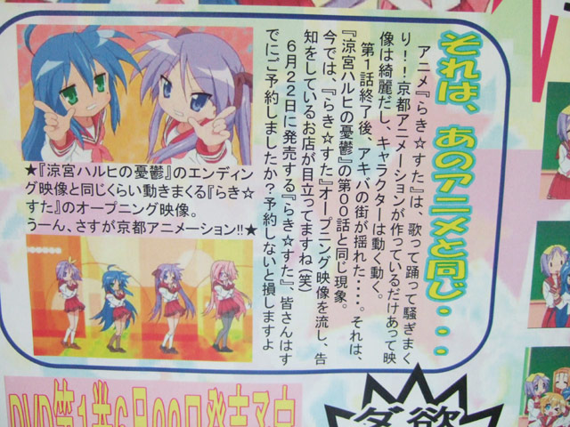 「アニメ『らき☆すた』は、歌って騒ぎまくり!!京都アニメーションが作ってるいるだけあって映像は綺麗だし、キャラクターは動くは動く。第1話終了後、アキバの街が揺れた・・・。それは、『涼宮ハルヒの憂鬱』00話(AA)のと同じ現象。今では、『らき☆すた』オープニング映像を流し、告知をしているお店が目立ってますね(笑) 6月22日に発売する『らき☆すた』、皆さんはすでにご予約しましたか?予約しないと損しますよ。」