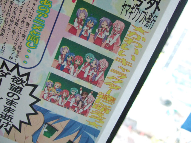 6月22日にアニメ「らき☆すた」のDVD「らき☆すた 1巻」(AA)が発売予定となっています。ヤマギワソフト本店では「らき☆すた 号外」とした、DVD「らき☆すた 1巻」(AA)の新聞風告知POPの掲示がされていて、それによると「DVD発売決定!いぇーい♪」「欲望のまま逝けダーン!」等と書かれ「それは、あのアニメと同じ・・・」という見出しの記事も。あのアニメとはこれのこと。