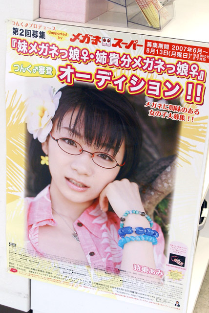 「ラップ呼び込み」と「萌え系メガネ」として秋葉原ブログさんで紹介されていたこともあるメガネスーパーAKIBA館にて、時東ぁみさんの「妹メガネっ娘♀・姉貴分メガネっ娘♀オーディション」のアナウンスがされていました。