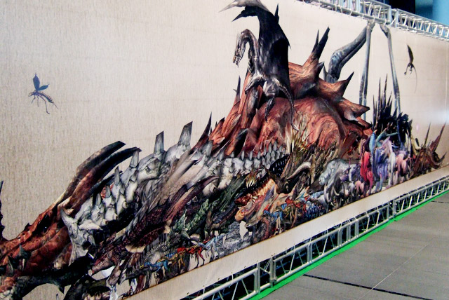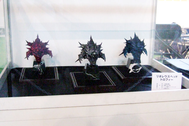 会場には、モンスターハンターに登場する、ほぼすべてのモンスターが描かれているらしい巨大パネルや、1/1スケールの剣、GILL GILL「タクティクス」や、勝者に与えられるリオレウスヘッドトロフィーの展示も。