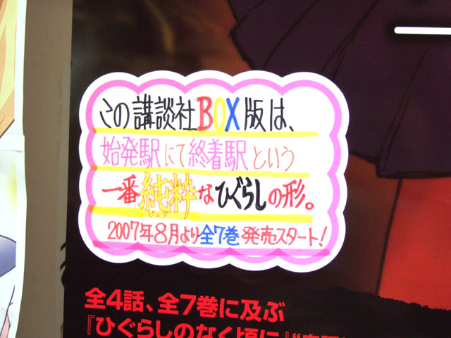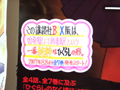 POPには「この講談社BOX版は始発駅にて終着駅という一番純粋なひぐらしの形。2007年8月より全7巻発売スタート!」と書かれていました。