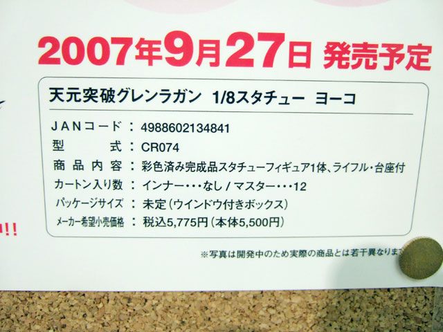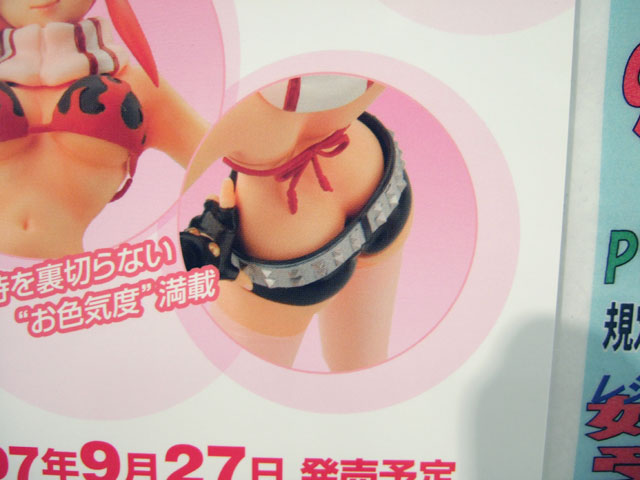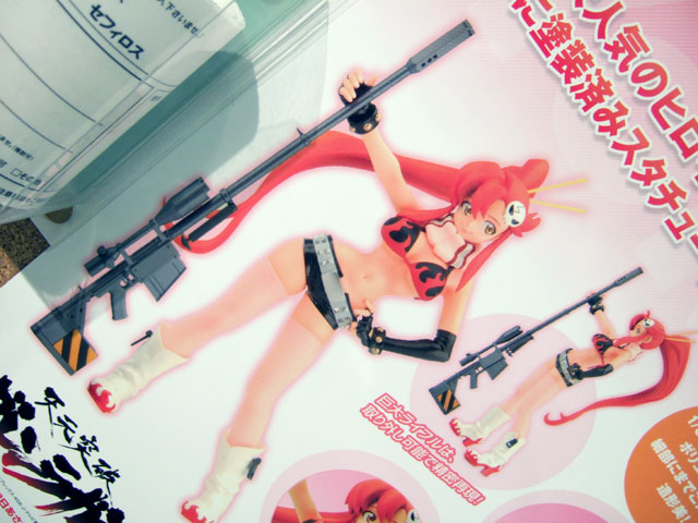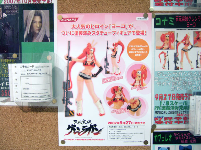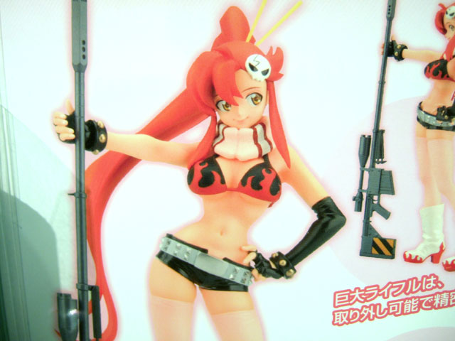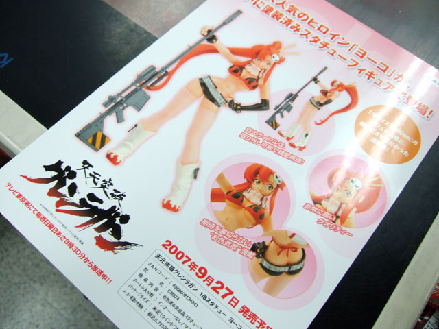 コナミ「天元突破グレンラガン 1/8スタチュー ヨーコ」(AM)の新しい発売告知POPがコトブキヤラジオ会館等で掲示開始していました。これは、アニメ「天元突破グレンラガン」の巨大なライフルを常に手放さない美少女スナイパーという「ヨーコ」を「“お色気度”満載」で立体化したというもの。POPには「お色気度」を伝えるための下乳や半ケツのアップ画像も掲載されていました。