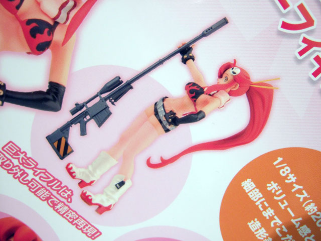 これは、アニメ「天元突破グレンラガン」の巨大なライフルを常に手放さない美少女スナイパーという「ヨーコ」を立体化したもので、あみあみの商品説明によると「TVアニメ「天元突破グレンラガン」からヒロイン「ヨーコ」が塗装済みスタチューフィギュアで登場!ファンの期待を裏切らない“お色気度”満載!!1/8サイズ(約20cm)のボリューム感と、細部にわたる細かい造形にこだわった商品です。ヨーコと言えば巨大ライフル。付属のライフルは取り外しが可能。更にスペアマガジン(弾倉)も付属します。ブーツ等も細かく造形。非常に高いクオリティーです! 」と紹介されています。