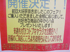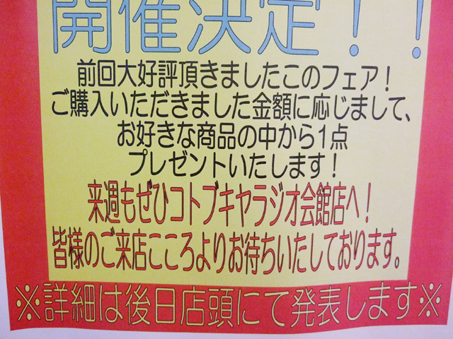 POPによると「前回大好評頂きましたこのフェア!ご購入いただきました金額に応じまして、お好きな商品の中から1点プレゼントいたします!来週もぜひコトブキヤラジオ会館店へ!皆様のご来店こころよりお待ちいたしております。」とされていました。