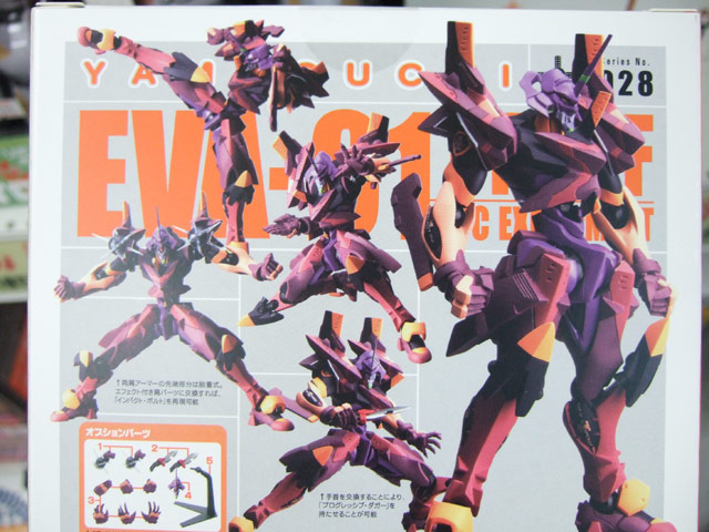 「No.028 エヴァ初号機F型装備」(AM)のパッケ表裏。右の画像は海洋堂ホビーロビーでのサンプル展示の様子。