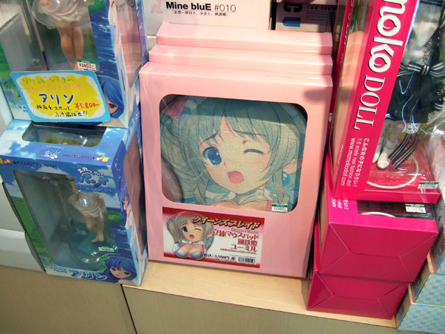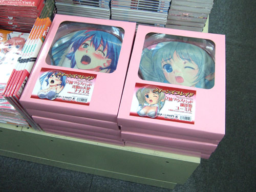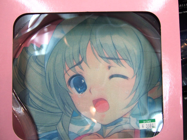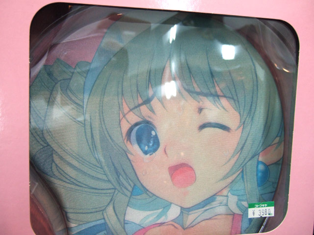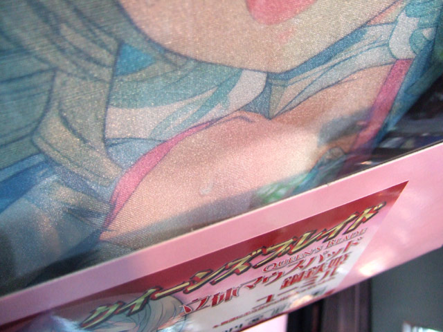 これは以前「聖乳(?)は各自でご用意ください」というPOPもあり、サンプル展示もお伝えしたことのある、クイーンズブレイドのキャラクターを、クイーンズブレイド公式の商品説明によると「胸の谷間を、やわらかジェル入りで完全立体化!」という、おっぱいマウスパッドにしたもので、2007年2月に発売された、「アイリ」「トモエ」に続く第2弾となるもの。