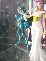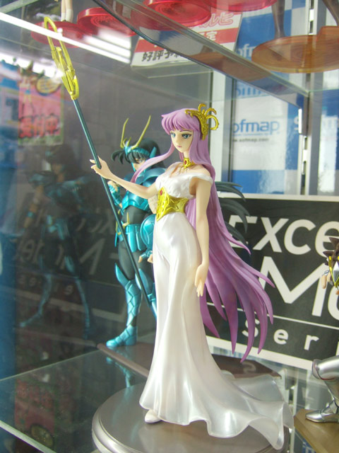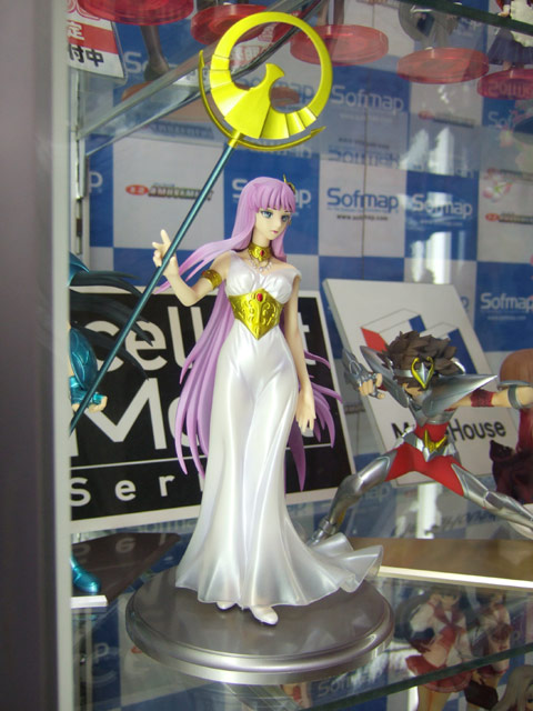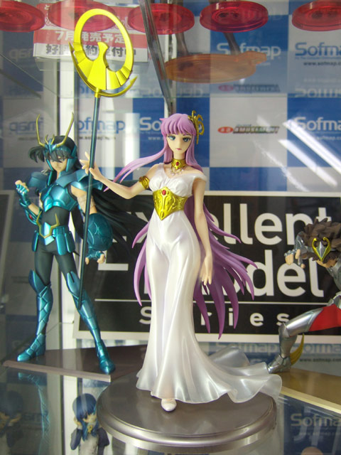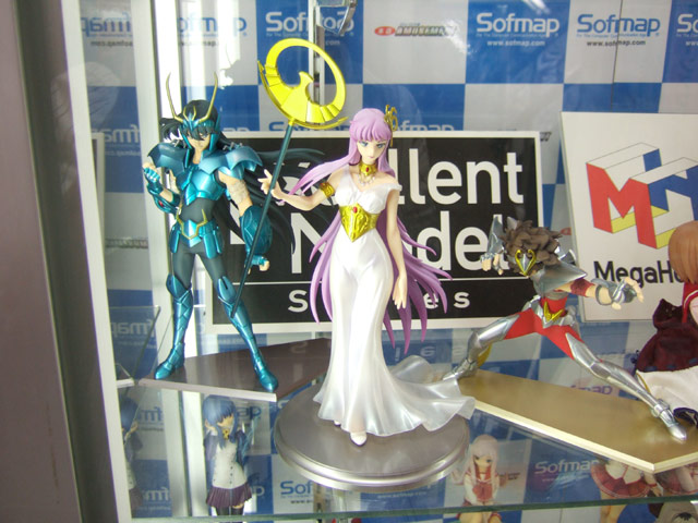 >メガハウス エクセレントモデル 聖闘士星矢「アテナ(城戸沙織)」(AA)、「ペガサス星矢」(AA)、「ドラゴン紫龍」(AA)3体のソフマップ本店でのサンプル展示の様子。