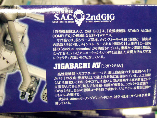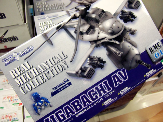 「攻殻機動隊 STAND ALONE COMPLEX Solid State Society」も発表され、未だに興奮冷めやらぬ近未来ポリスアクションの決定版「攻殻機動隊 S.A.C GIG」よりタチコマ最大の天敵「ジガバチAV」がプラスチックキットで登場です。本編24話〜25話でのタチコマとの戦闘シーンが有名で、機体後部のハチの針に模した機関銃が特徴です。今回はジガバチと同スケールのタチコマも付属。また、写真の飛行用ベースも付属しますので、ジガバチと一緒に飾ることで本編での激戦が再現できます。