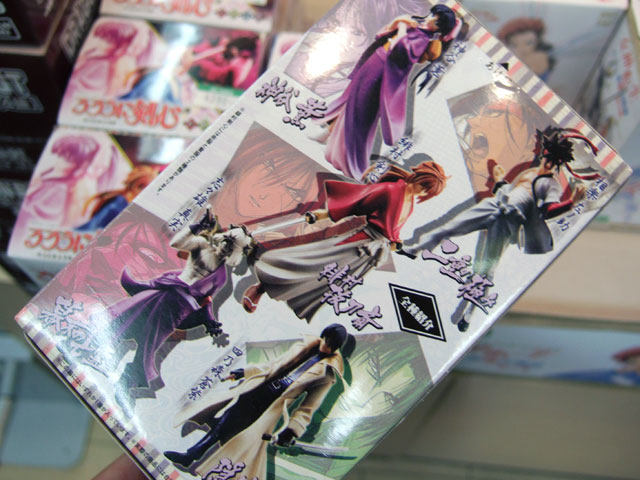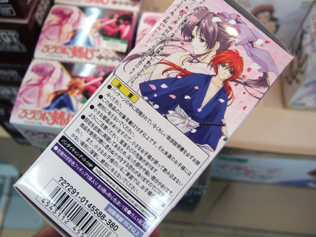緋村剣心、神谷薫、相楽左之助、四乃森蒼紫、志々雄真実の5種+色違い1種の全6種。1BOX10個入り。