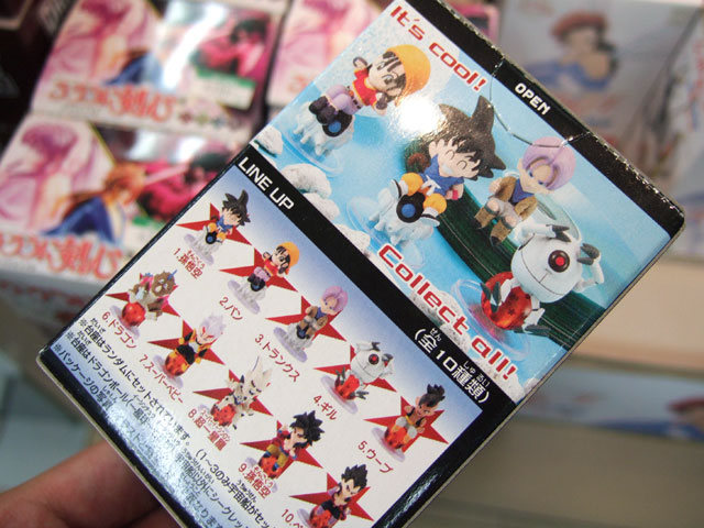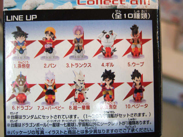 孫悟空、パン、トランクス、ギル、ウーブ、ドラゴン、スーパーベビー、超一星龍、孫悟空(スーパーサイヤ人4)、ベジータの全10種類+シークレット。1BOX10個入り。