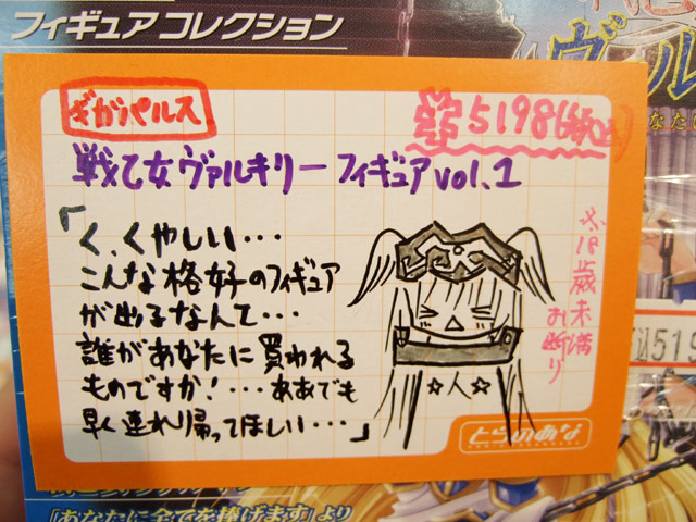 これは、ワンフェス2007冬でサンプル展示もあった、ルネが2004年7月に発売したエロゲ「戦乙女ヴァルキリー」のヒロイン「ヴァルキリー」を立体化した、発売時のとらのPOPで「く、くやしい・・・こんな格好のフィギュアが出るなんて・・・誰があなたに買われるものですか!・・・ああでも早く連れて帰ってほしい・・・」というものもあった「vol.1」(AA)に続く、シリーズ第2弾となるもので、ギガパルスの商品説明によると「ゲーム中のシチュエーション、「エッチな鎧」を身に着けての公開オ〇ニーショウを演じるヒロイン:ヴァルキリーを再現!捕らえられ拘束されたVol.1フィギュアより更にエロチシズムがUPした仕上がりです。〜原型はVol.1フィギュア同様、あの有名原型師(本人の希望により匿名となっております)が製作!!アンダー○アはもちろん、その先がある!!クオリティ&エロチシズムのハイブリット!それがギガコレです!!あなた自身の五感で、ぜひ堪能してください!!カチューシャパーツ、腰回りのパーツは脱着可能! 」と紹介されています。