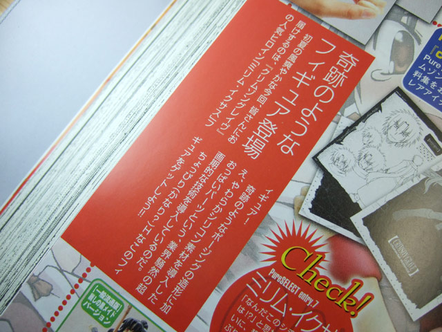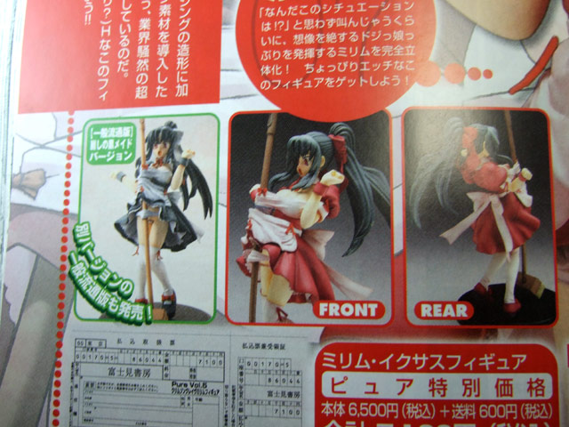 2007年4月に発売された「ドラゴンエイジピュア 2007年 06月号」(AA)では、とら1号店のPOPで「こいつはもう付録ってLVじゃねぇぞ!!」とされていた、グッスマ製作の「九条蜂恵」フィギュア(参考レビュー)が付属していましたが、今号では、裏表紙でも紹介されているように「クリムゾングレイヴ ミリム・イクサス 情熱のメイドVer.」の応募用紙がついています。