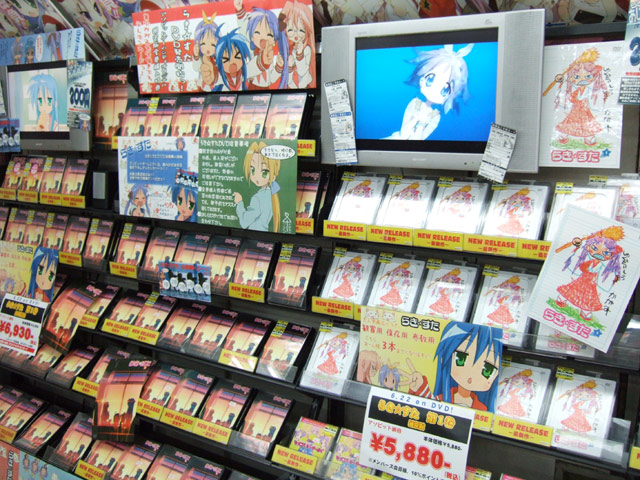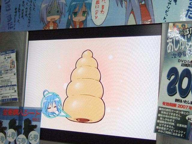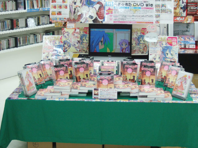 6月21日、DVDらき☆すた 1巻の 通常版(AA)と限定版2種が発売されました。アキバの各店では様々な展開をしてました。ゲーマーズ本店にあった「実家がセブンイ○ブン」の店員Rのひとりごとによると「親子2代でらき☆すた売ってるのって結構レアかも、とか思いました 埼玉の片田舎でやたらチョココロネ積んでるセブンがあったら俺んちかも知んないです。」とのことw