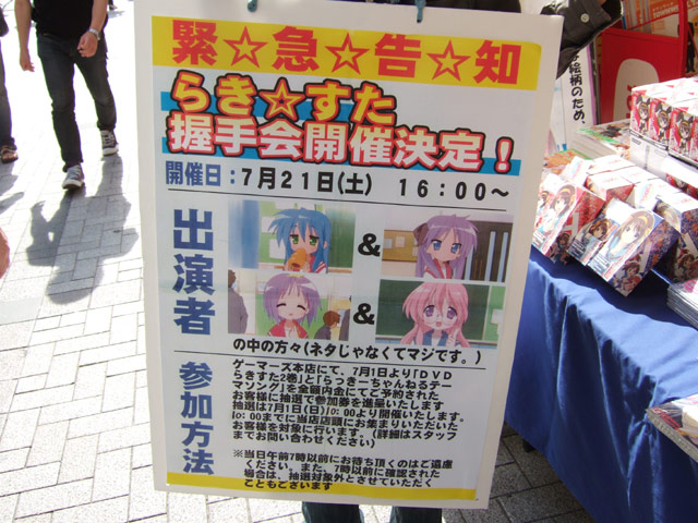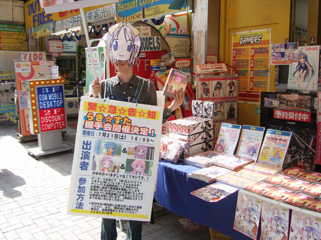 2Fでも大きく展開されていて、そこに掲示されていた「店員Rのひとりごと」には「やー遂に発売してしまいました。らき☆すた1.発売までにイロイロあってちょっと大変でした。いや、でもすごい楽しかったし、コレすごい楽しくなりますヨ。確実に。よかったらどうぞ。全然関係ないですが、実家がセブンイ○ブンだったりします。らき☆すた1はセブンでも売ってるですよ。このあいだ気付いたんですが親子2代でらき☆すた売ってるのって結構レアかも、とか思いました 埼玉の片田舎でやたらチョココロネ積んでるセブンがあったら俺んちかも知んないです。」と書かれていました。