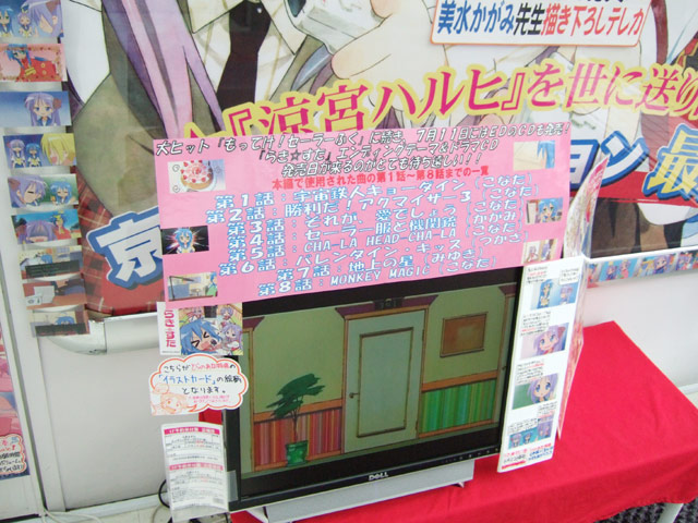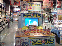 とらのあな本店でも、平段に展開して販売していたほか、7月11日発売予定の「らき☆すた エンディングテーマ&ドラマCD」の告知もしていて、第1話から第8話までのED曲をまとめたPOPが掲示されていました。