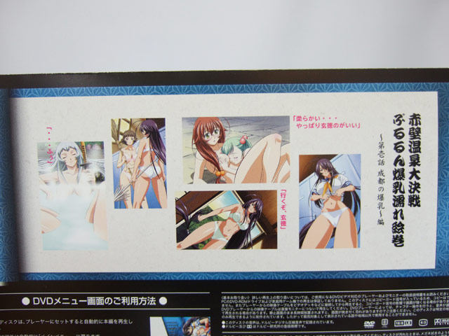 OVA「赤壁温泉大決戦」第壱話は、公式の商品説明によると「美少女闘士たちが爆乳ボディを大胆に露出!温泉に浸かって爆走、野球拳などでものすご〜くHに乱れまくりできっと何かが起きちゃう!?」と紹介されていて、実際乳首丸出し映像がこれでもかと収録されていましたw