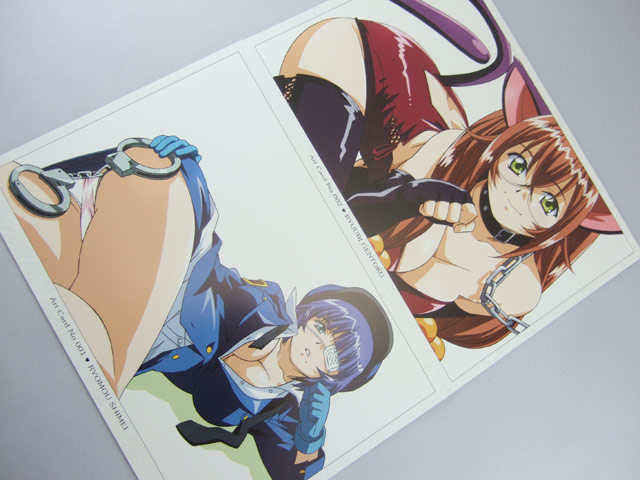 ジャケットをあけた様子と、リバーシブルジャケットの、なぜかパンツ脱ぎ掛けな関羽、美少女闘士セクシーイラストカード×2枚、