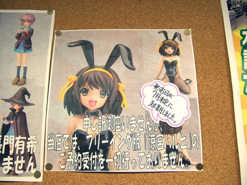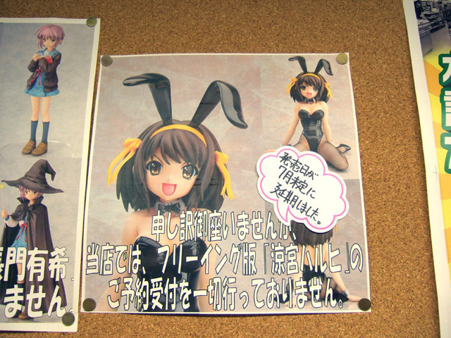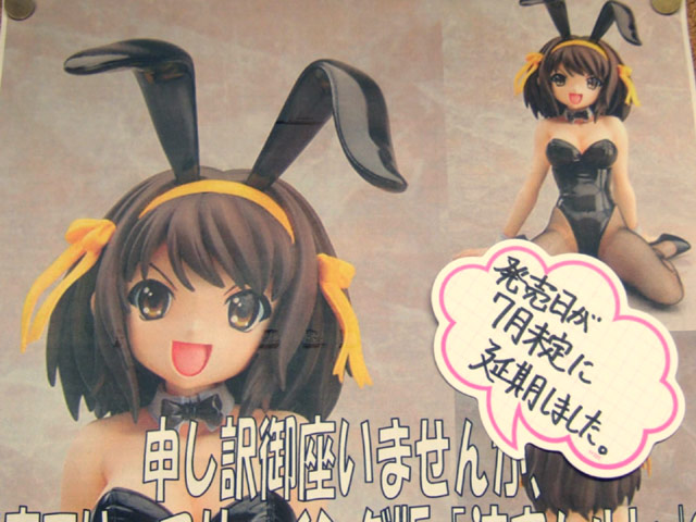 以前、下から見るとM字開脚なサンプル展示をお伝えした、FREEing「涼宮ハルヒの憂鬱 涼宮ハルヒ バニーVer.」の発売が7月未定に延びたみたいで、コトブキヤラジオ会館に延期の告知が掲示されていました。