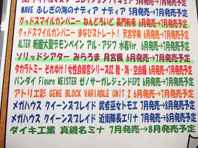 こちらは、とらのあな本店で掲示されていたフィギュア発売日変更リスト。