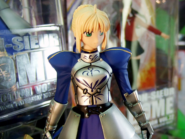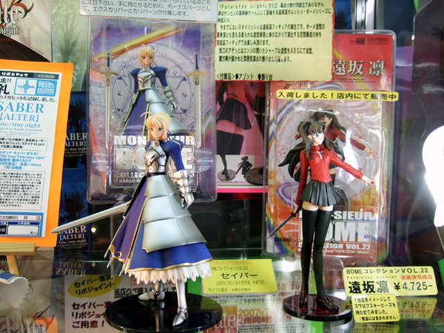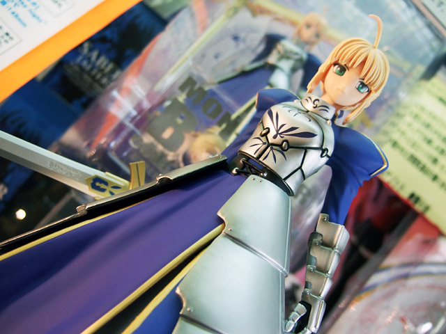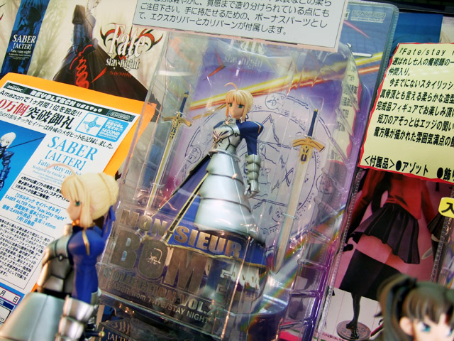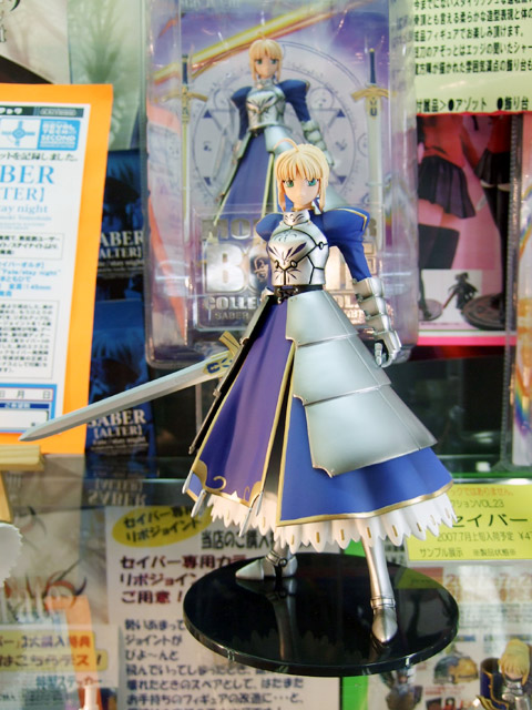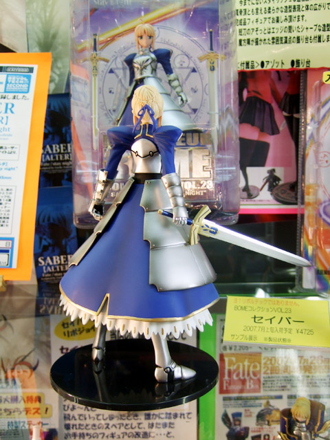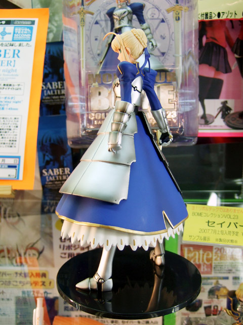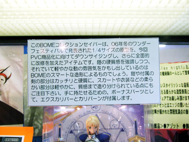 掲示されていたPOPの解説によると「このBOMEコレクションセイバーは、06年冬のワンダーフェスティバルで発表された1/4サイズの原型を、今回PVC商品化に向けてダウンサイジングし、さらにポーズ変更など、全面的に改修を加えたアイテムです。鎧の硬質感を強調しつつ、それでいて軽やかな動の雰囲気をもかもし出しているのは、BOMEのスマートな造型によるものでしょう。鎧や付属の剣の部分はカッチリと硬質に、スカートや衣装などの柔らかい部分は軽やかに、質感まで造り分けられている点にもご注目下さい。ボーナスパーツとして、エクスカリバーとカリバーンが付属します。」と紹介されています。