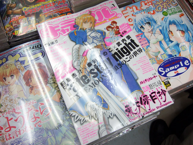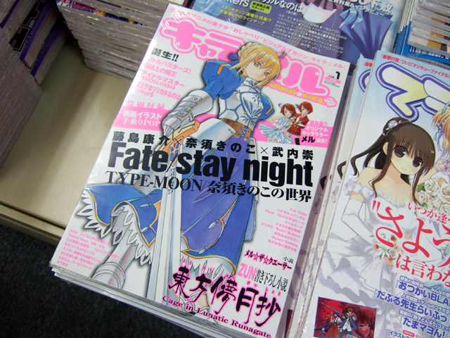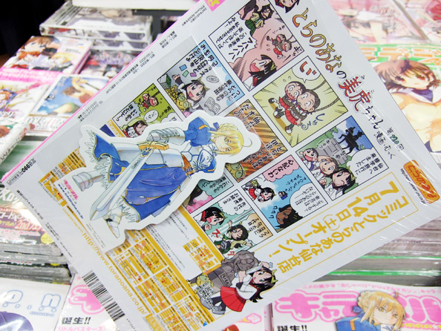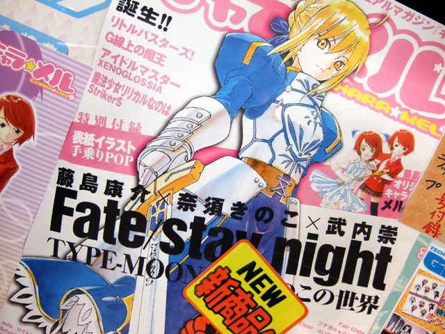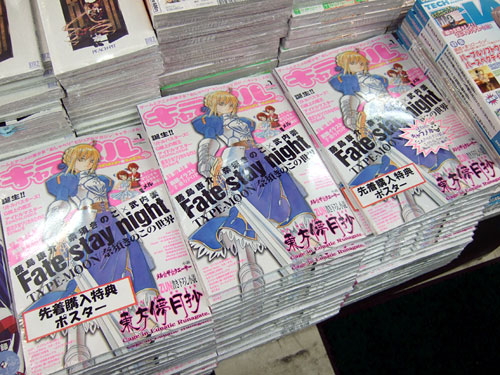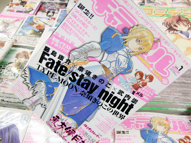 先週末にも見かけた気もしますが、以前、告知POPが藤島康介氏イラストのセイバーだったことをお伝えした、一迅社「キャラ★メル 創刊号」(AA)が発売されました。これは、公式の商品紹介によると「ゲームとアニメの美少女”おしゃべり”マガジン」「美少女キャラが語りかける」というビジュアルマガジン。表紙はやはり、付録の手乗りPOPにもなっている、藤島氏版セイバー。