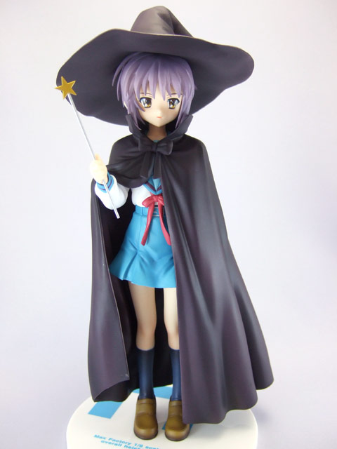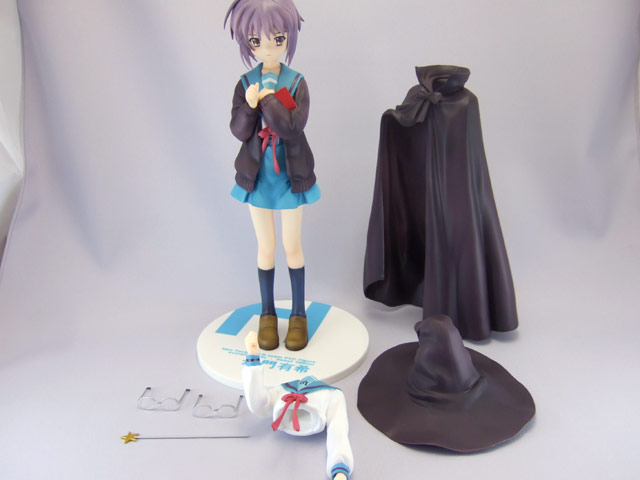 これは、ハルヒ(参考レビュー)、みくる(参考レビュー)に続く、マックスの「涼宮ハルヒの憂鬱」フィギュアシリーズの第3弾で、マックスファクトリーの商品説明によると「『涼宮ハルヒの憂鬱』フィギュアシリーズ第三弾に、SOS団3人娘の最後の一人「長門有希」がついに登場!帽子にマントにスターリングインフェルノ、劇中劇「朝比奈ミクルの冒険」で活躍した姿そのままに立体化。無表情にたたずむ姿は怪しくも可愛らしく、とっても有希らしい。さらにさらに!パーツを付け変えることで、有希ファンなら必ず欲しいカーディガン姿にも!印象のガラッと違う「悪い魔法使いVer.」「カーディガンVer.」の2バージョンが楽しめる、一粒で二度美味しいフィギュアです。」と紹介されています。