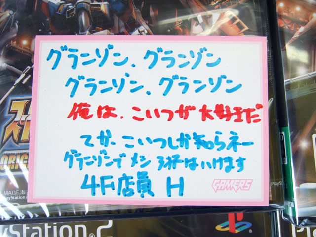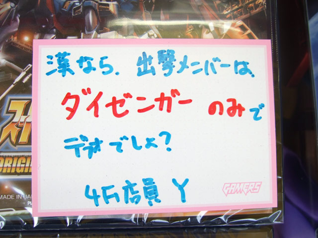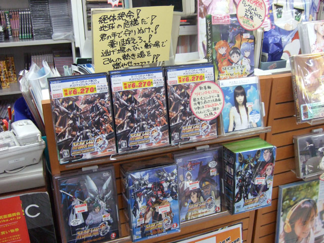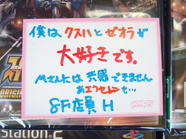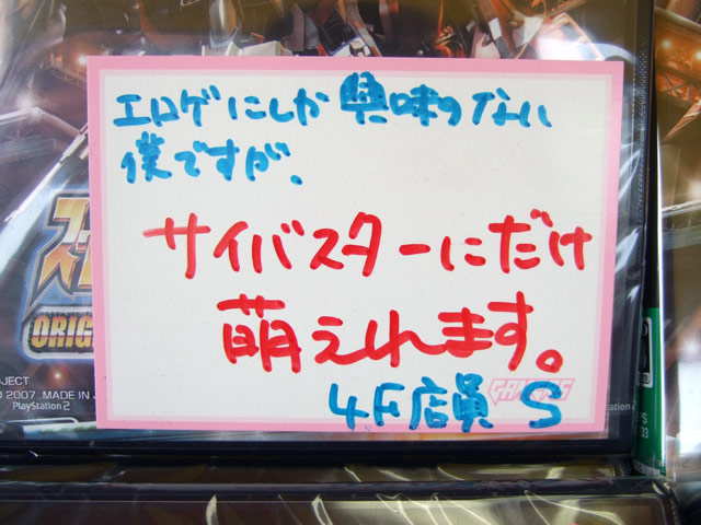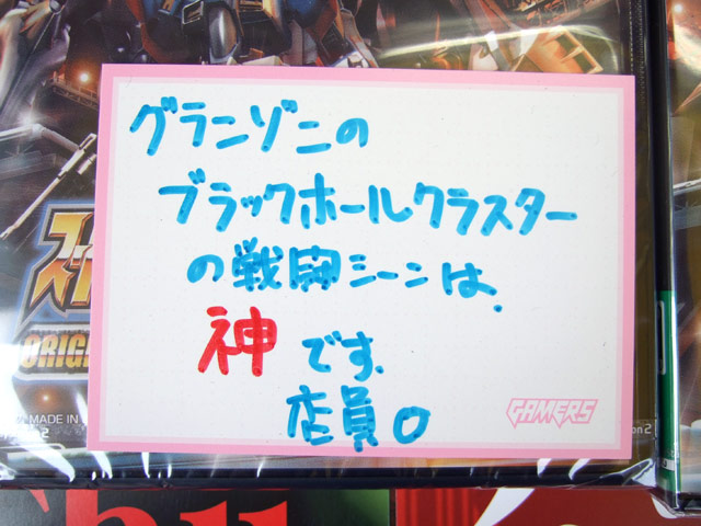 ゲーマーズ本店には、「グランゾンでメシ3杯はいけます」とか「サイバスターにだけ萌えれます。」、「今回も乳のゆれはスバラシイ!!」、「俺の右手が真赤に唸る!」「グランゾンのブラックホールクラスターの戦闘シーンは、神です。」など、スパロボに思い入れのある店員さんが少なくとも8人はいるらしく、8種8様の様々なコメントPOPがはられていましたw