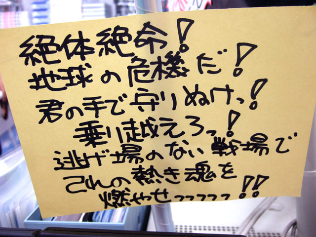 普段ゲームの置かれていない3Fでも、カウンター前で販売していて、POPには「絶体絶命!地球の危機だ!君の手で守りぬけっ!乗り越えろっ!逃げ場のない戦場で己の熱き魂を燃やせっっっっっ!!」と書かれていました。