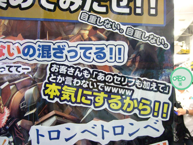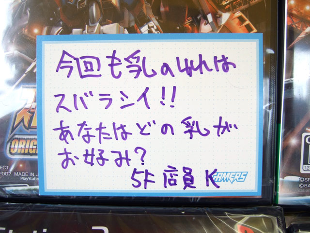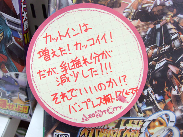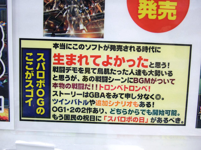 さらに4Fでも販売していて、こちらのPOPでは「今までのスパロボとは何か違うわ」「夏休みまで待ってる場合じゃない!むしろGETして早めの夏休みを(ry」「カットインは増えた!カッコイイ!だが、乳揺れ分が減少した!!!それでいいのか!?バンプレスト!?(←マテ」などと書かれたコメントPOPが掲示されていました。