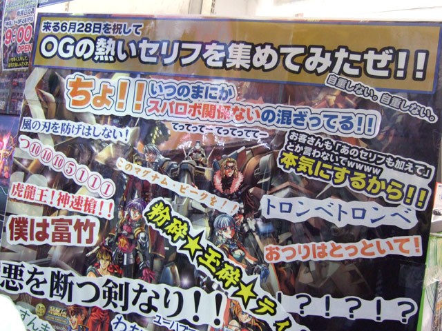 ほか、「OGの熱いセリフをあつめてみた」として、様々なセリフが掲示されていましたが、中には「おっくせんまん!おっくせんまん!」とか「バルサミコ酢〜」とか、多分関係なさそうなものも含まれていて、POPにも「ちょ!!いつの間にかスパロボ関係ないものが混ざってる!!」とも書かれていました。