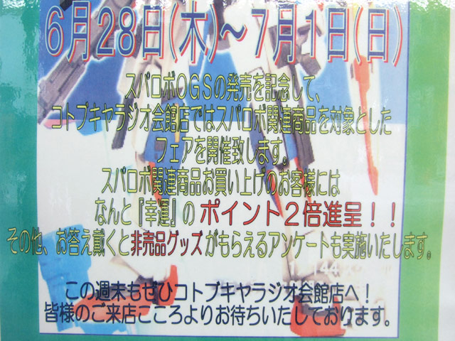 コトブキヤラジオ会館では、ゲームは取り扱っていないものの、「スーパーロボット大戦OG オリジナルジェネレーションズ」(AA)の発売を記念して、6月28日(木)〜7月1日(日)にあいだ「スパロボ関連商品お買い上げのお客様にはなんと「幸運」のポイント2倍進呈!!その他、お答え戴くと非売品グッズがもらえるアンケートも実施いたします。」としたイベントを実施していました。