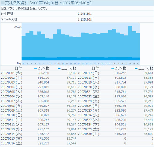 総ヒット数は936万6591。総ユニーク数は113万5408でした。トップページへのアクセス116万0825PV。(内、新環境トップは163万4039、旧ライブドアブログトップは2万5417)