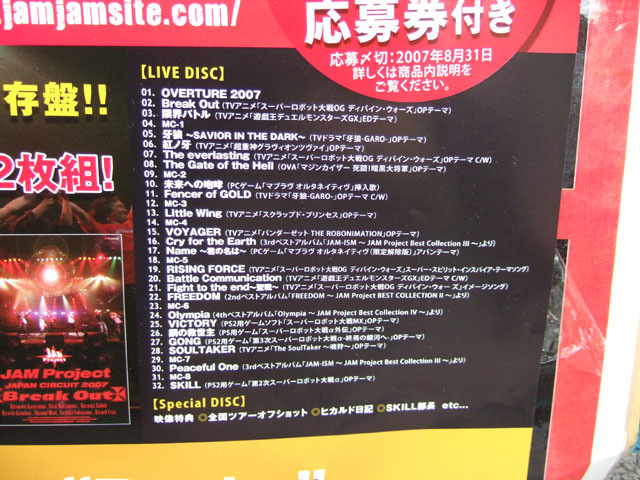 DVD「JAM Project JAPAN CIRCUIT 2007 Break Out」(AA)のジャケット表裏と、掲示されていたポスターに掲載されていた収録映像リスト。
