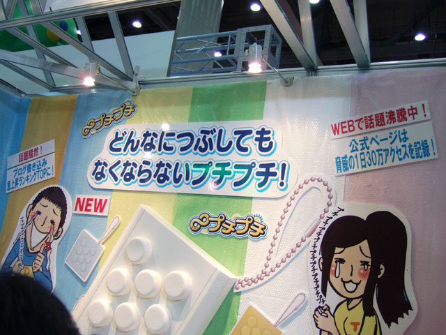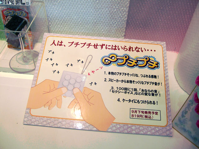 POPでは「1.本物のプチプチそっくりな、つぶれる感触!2.スピーカーから本物そっくりなプチプチ音が!3.100回に1回、「おならの音」「セクシーボイス」などの変な音が!4.ケータイにもつけられる!」と紹介されています。