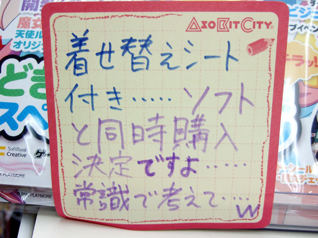 中央右の画像が魔女神判!シール、一番右がゲームシティのPOPで「着せ替えシート付き・・・ソフトと同時購入決定ですよ・・・常識で考えて・・・w」とされている着せ替え人形シート「らぶらぶお着替え・赤井まほ♪」。