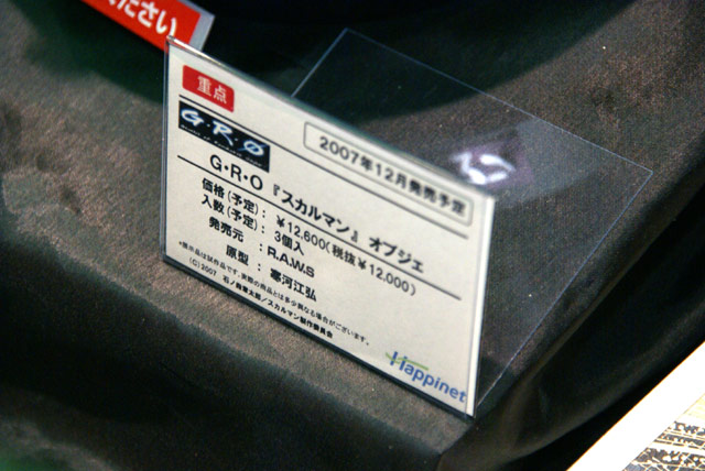 東京おもちゃショー2007のハピネットロビンブースでは「G・R・O スカルマン オブジェ」(AA)のサンプルが展示されていました。これは、掲示されていたPOPによると「日本が誇るべき、魅力的な和製キャラクターたちを『アートオブジェ』として表現する」という「Genesis of Romantic Object〜G・R・O〜」の第1弾として、石ノ森章太郎氏原作の「スカルマン」を立体化したもの。