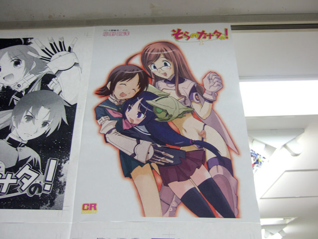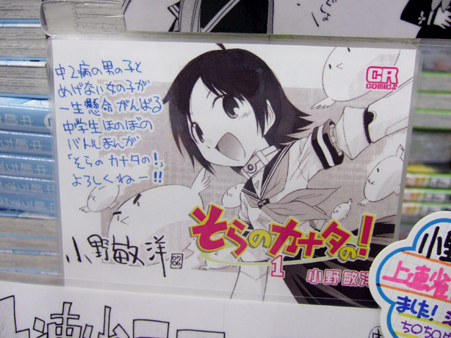 ジャイブ コミックスそらのカナタの! 1巻」(RA)は、月刊コミック ラッシュの作品紹介によると「”そらの”は、とあるフツーの町のフツーの中学校のフツーに元気な女子中学生。ところがある日、空に巨大で不気味な魚のような物体が現れ、そらの以外の人間はみんな石のようになってしまった! そして、そんな世界になってしまうことを、はるか大気圏外の宇宙船から予言していた謎の少年がいた──! 世界はいったいどうなっちゃうの!?」という、月刊コミック ラッシュ連載の全年齢向けコミックですが、作者の小野敏洋氏の書かれた『中2病の男の子とめげない女の子が一生懸命がんばる中学生ほのぼのバトルまんが「そらのカナタの!」よろしくねー!!』という告知POPの下に「小野先生の無二の親友 上連雀先生よりメッセージもらいました!注:カナタちゃんにはまだち○ち○生えてません(笑)いけるか?ジャイブ!!」として、「注・はえてます!」というカナタと、そらのがなぜか下半身裸で密着しているイラストを掲示。