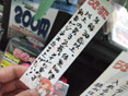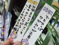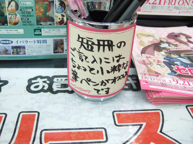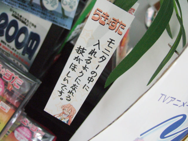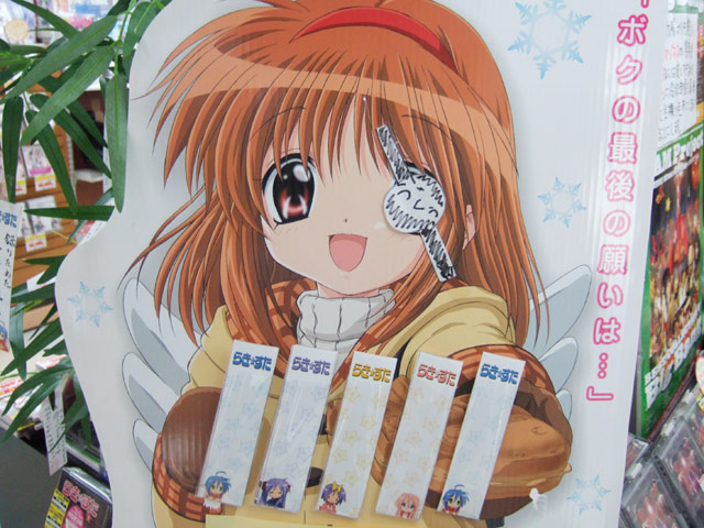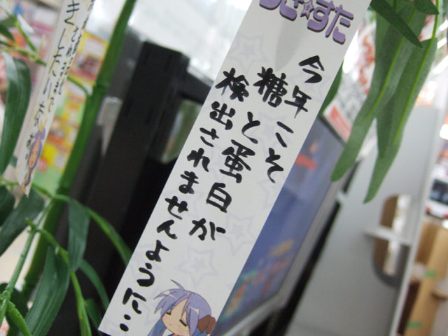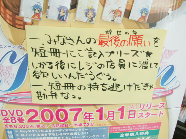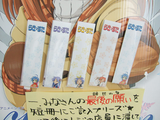 POPには「みなさんの最後の願い(辞世の句)を短冊にご記入プリーズ★しかる後にレジの店員に渡して欲しいんだうぐぅ。」とかかれていて、アニメ「らき☆すた」のこなた、かがみ、つかさ、みゆき、あきら等のキャラをあしらった短冊が用意されていました。