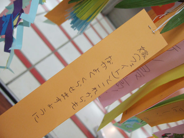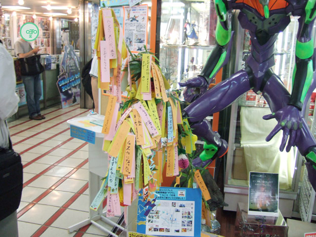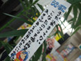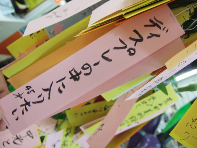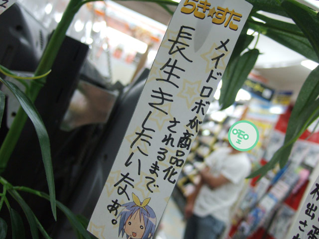 POPの横に設置された笹には、既に結構な数の短冊が付けられていて、いくつかかいつまんでみたところ、「今年こそ唐と蛋白が検出されませんように・・・」「メイドロボが商品化されるまで長生きしたいなぁ。」「フィギュア化されたい。32才 アルバイト 男」「録りためたアニメを観てから逝かせてね・・・」「モニターの中に入れるようになれる技がほしいです。」「でもやっぱかがみんが正妻!!」「垣間見える「黒さ」も童女のような「ピュア」さもひっくるめてオラが嫁!」「まだ染まってないこなたのママを嫁に所望 あ、オラがあっちの世界に行きゃいいのか。」「年齢30歳以上。体重100kg以上の男子急募。メイドに変わる執事ビジネス立ち上げたい!」等とかかれていました。