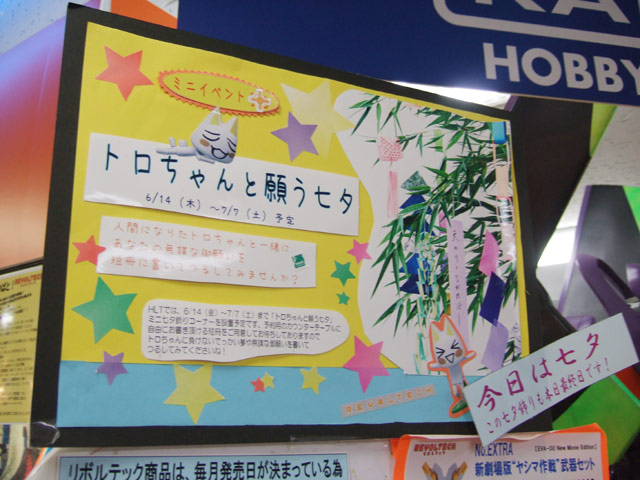 ほか、海洋堂ホビーロビーでもトロちゃんと願う七夕として、短冊を書くイベントが7月7日まで開催されていて、こちらには「嫁(フェイト)とこれからもなかよくくらせますように」「ディスプレーの中に入りたい 45才」「夏コミの新刊が間に合いますように」等といった内容のものが見受けられました。