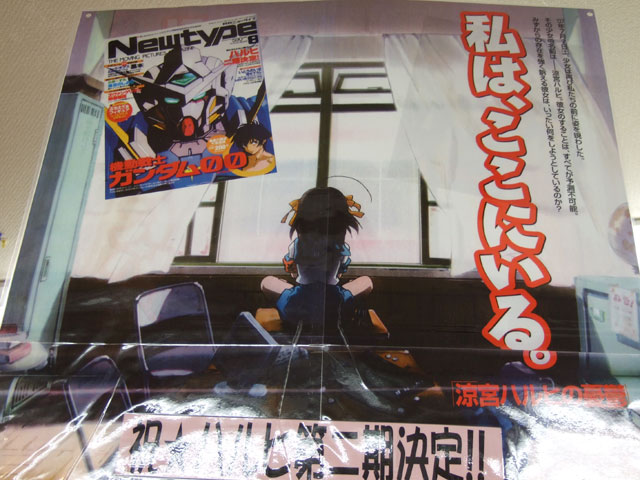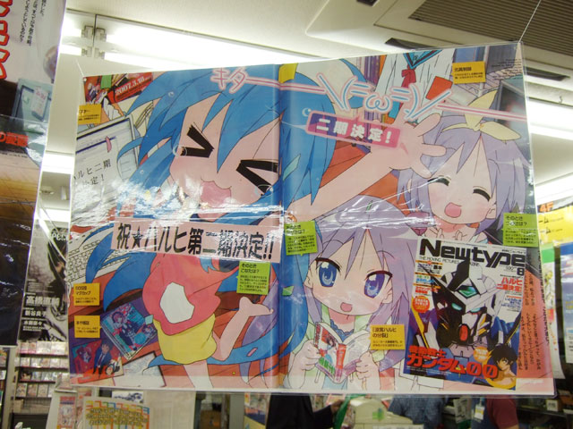 角川書店ニュータイプ 8月号」(AA)が7月10日に発売されました。紙面では、7月7日に新聞広告で発表された「ハルヒ二期決定」の特集がされていて、ゲーマーズ本店では「祝★ハルヒ二期決定!!」として、公式の商品説明で「らき☆すたの面々も大喜び」とされているサンプルページを大きく掲示。もう一つのPOPでは、新聞広告と同じ絵柄のハルヒの後姿でした。