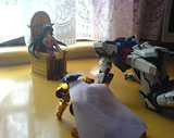 yamaさん作品タイトル「ガロですが何か?」 受賞者のコメント ガロフィギュアの余ったコートと武器を一輝兄さんとジークさんに着せたらなんかえらい似合ったのでやってみました。盗られたガロゼロが後ろでおまわりさんに相談です。 |