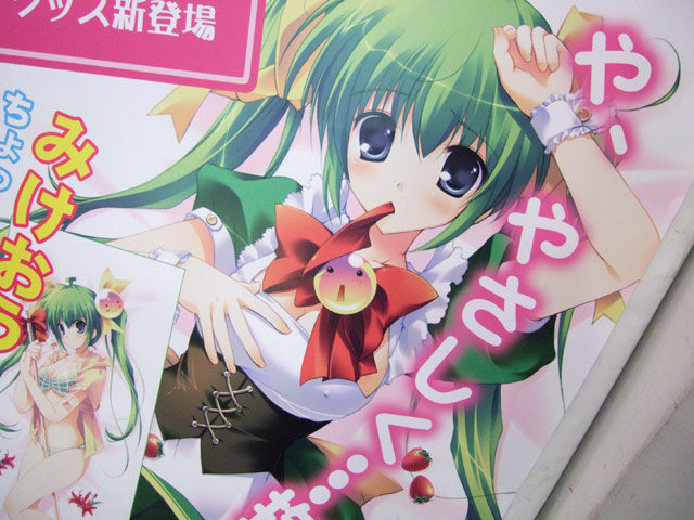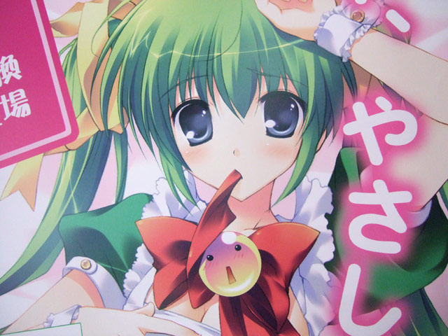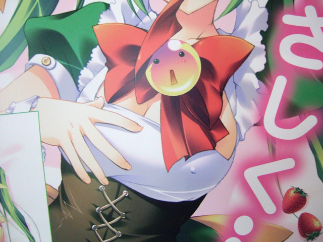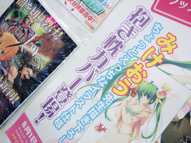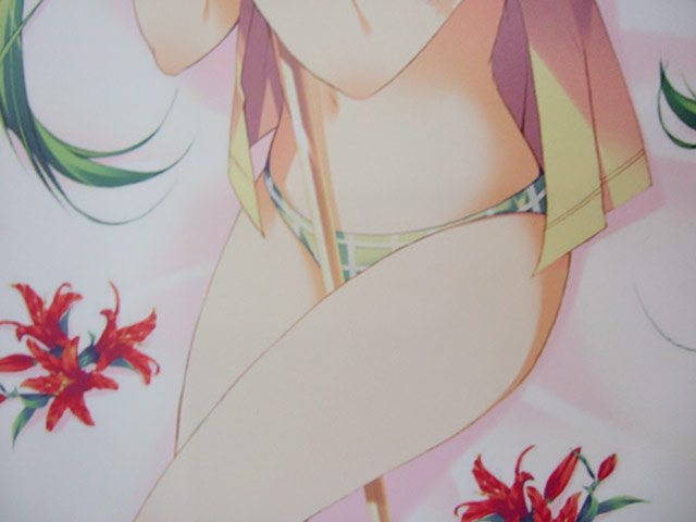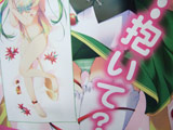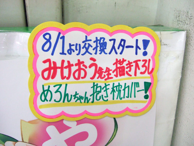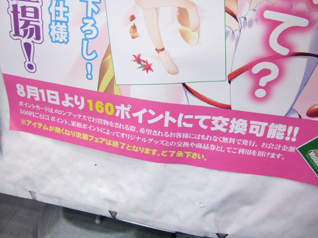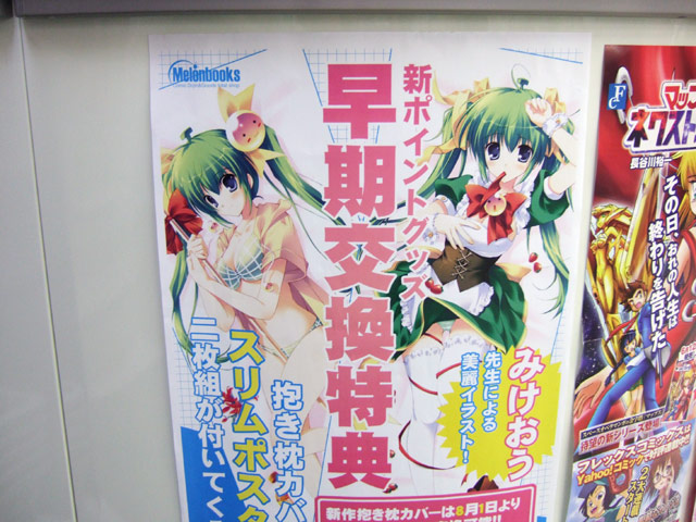 メロンブックスは、金棒股間押し当てテレカや、パンツ見せてるクッション等、独自のポイントカードのポイントで交換できるグッズがありますが、「や、やさしく・・・抱いて?」として、乳首勃起パンツみけおう氏イラストの160Pでの交換グッズ「メロンちゃん抱き枕カバー」の交換が8月1日開始という告知が掲示されていました。イラストは両面で、裏面はメロン柄ビキニのイラスト