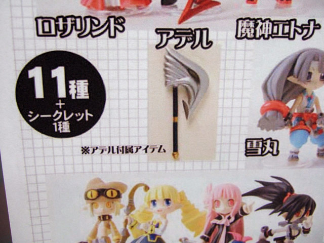 とらのあなPalmCharacters 魔界戦記ディスガイア2」(AM)のサンプル展示がとらのあな本店にて開始しています。これは、PS2「魔界戦記ディスガイア2」の、ロザリンド、アデルや、マックスからすこい食い込みパンツのフィギュアも発売されている、魔人エトナ等のキャラクターやユニットを、デフォルメして立体化したトレフィです。展示されていたのはシークレットを除く11種。