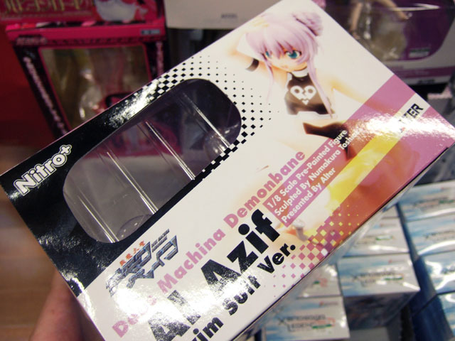 これは、以前ドリパ東京2007春でサンプル展示もあった、ニトロプラスのエロゲ「斬魔大聖デモンベイン」のヒロイン「アル・アジフ」を水着姿で立体化したもので、グッスマの商品説明によると「浜辺ではしゃぐ、最強の魔導書。荒唐無稽スーパーロボットアドベンチャー『斬魔大聖デモンベイン』より、傲慢不遜な魔道書”ネクロノミコン”の精霊「アル・アジフ」を水着姿で立体化です。浜辺で魅せる愛らしく楽しそうな眼差しは、見る者の瞳を離しません。砂浜をイメージした台座や落ちかかったサンダルが臨場感を出しつつ、表情の豊かさから好感が持てる仕草にまとめました。 」と紹介されています。