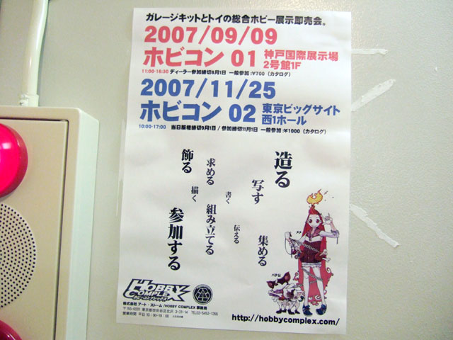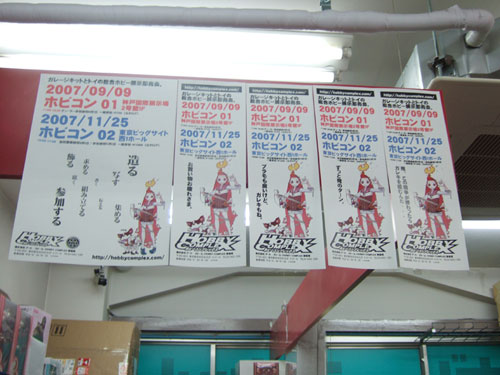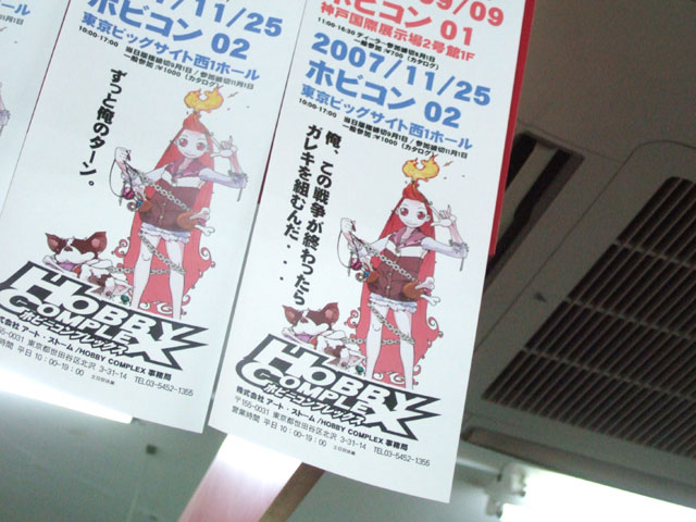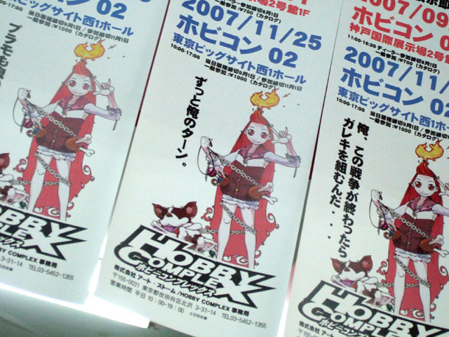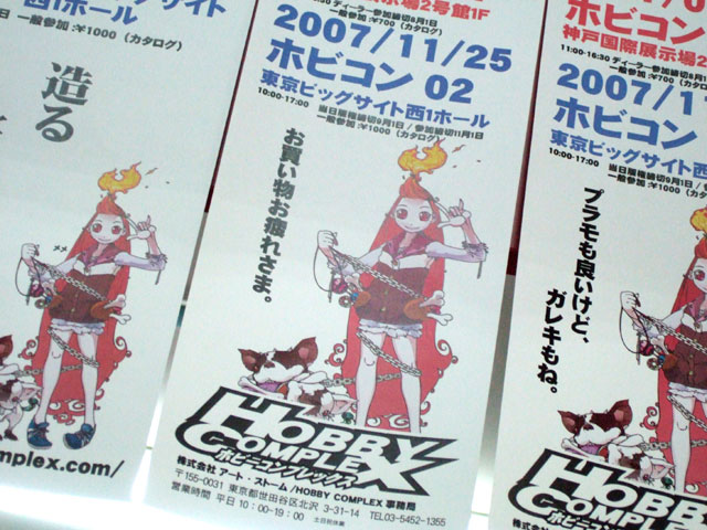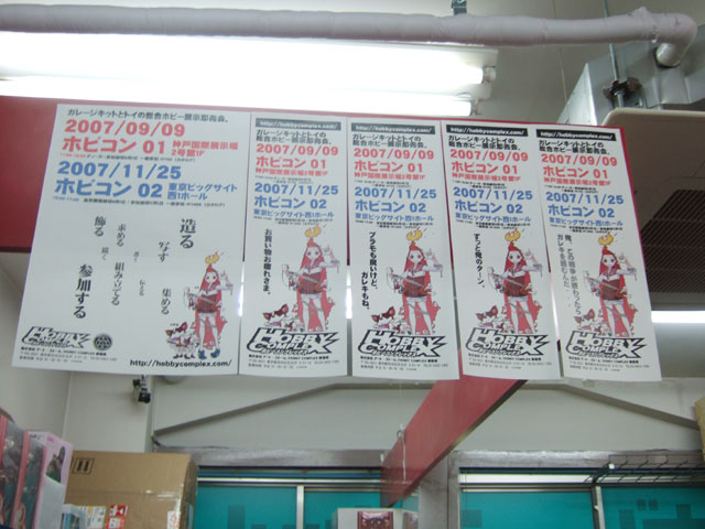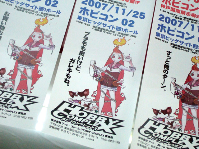 9月9日に神戸国際展示場にて初開催となる、アートストーム主催のガレキ&TOY総合展示即売会「ホビーコンプレックス」の告知展開がアキバでも開始されました。これは、開催概要によると「造る・組み立てる・飾る・描く・求める・集める・見つめる・・・写す・書く・伝える・・ 〜これらを複合的にもっともっと楽しんで頂くためのオールジャンルのホビーイベント」とのこと。