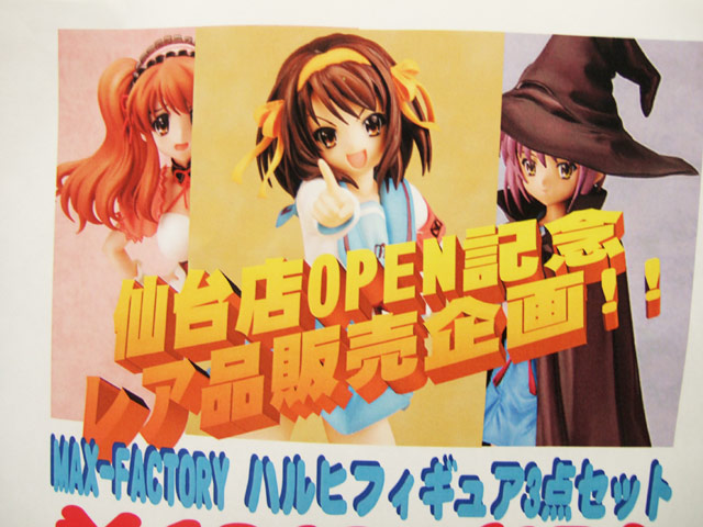 他、掲示されていたPOPでは「仙台店OPEN記念 レア品販売企画!!」として、マックスのハルヒ3点セット(ハルヒ/みくる/長門)販売の告知も掲示されていました。