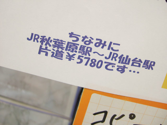ちなみにPOPによると、JR秋葉原駅〜JR仙台駅魔での片道の電車賃は5780円とのことです。