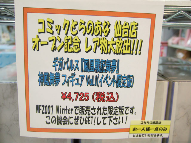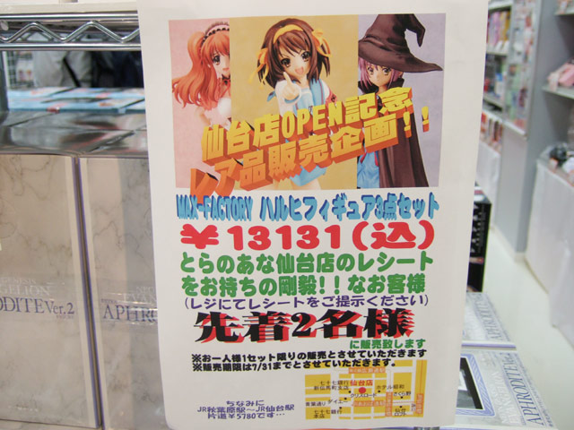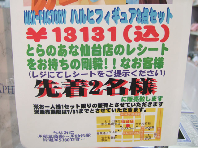 7月14日、とらのあな仙台店がオープンとなり、とらのあな本店でも町田店開店時同様、ギガパルスの限定品などが販売されてました。他、POPには「仙台店OPEN記念 レア品販売企画!!」として、マックスのハルヒ3点セット(ハルヒ/みくる/長門)を「とらのあな仙台店のレシート持参の先着2名に販売」とかかれていました。POPによると秋葉原〜仙台は片道5780円。